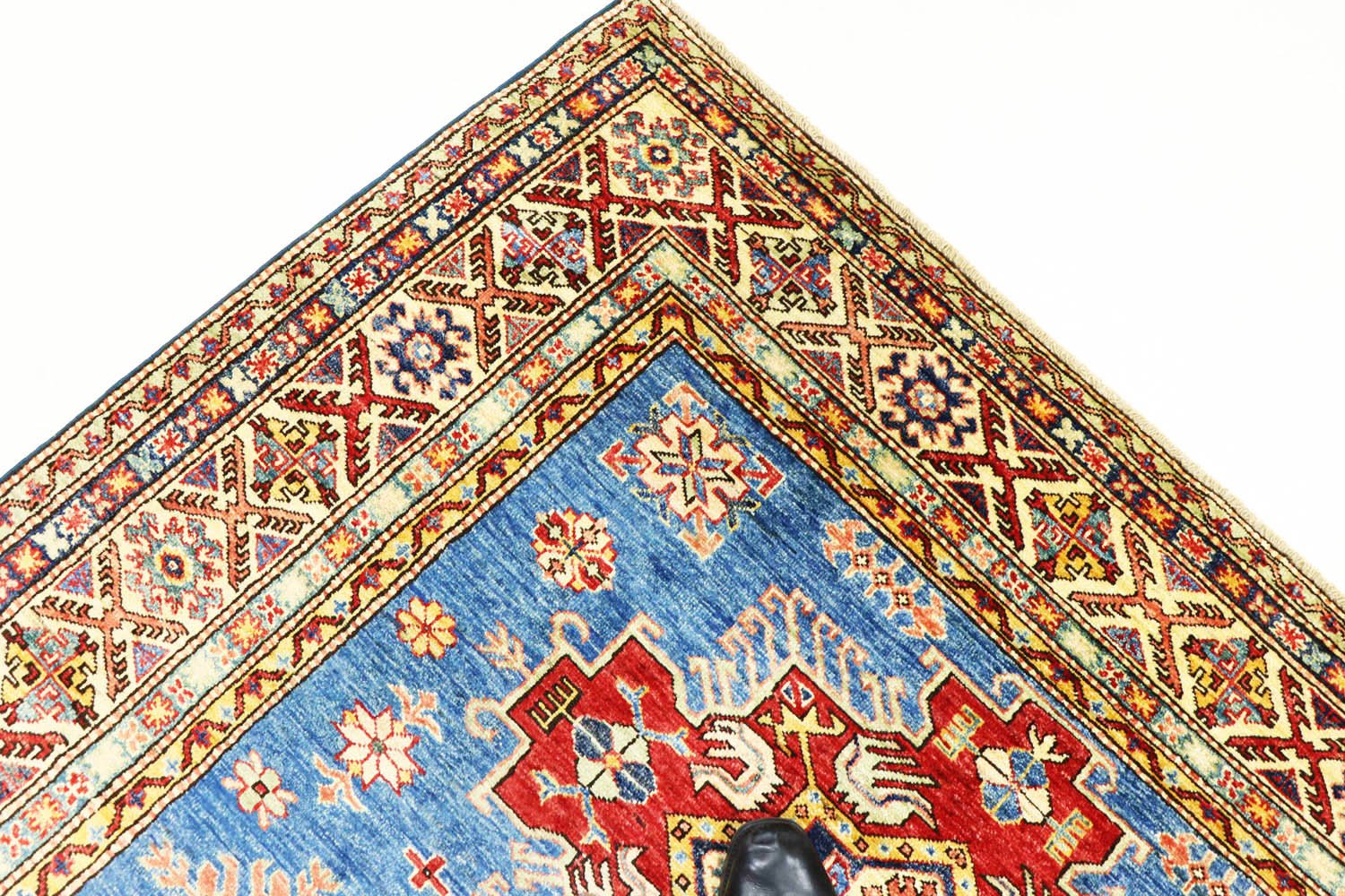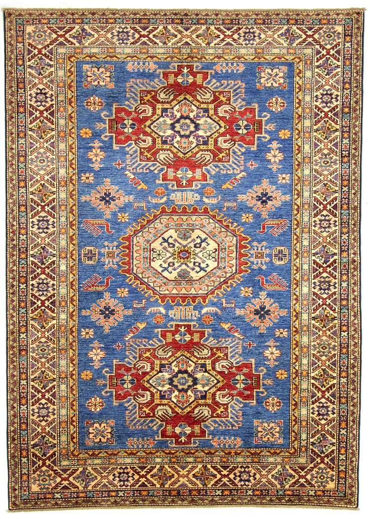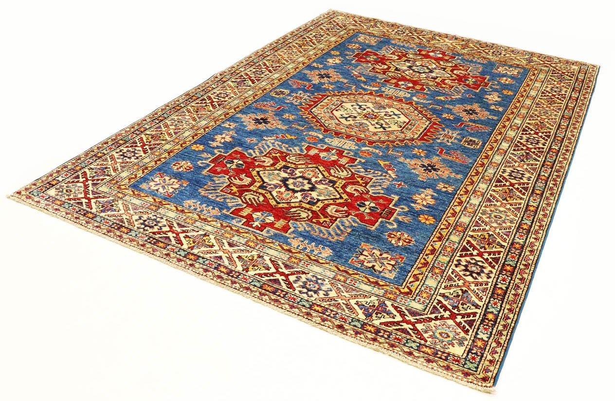 This hand-knotted Kazak was made in the style of traditional Caucasian carpets and is characterised by its high robustness and vibrant colours. It embodies the rich culture of the Caucasus in a breathtaking composition that reflects the centuries-old art of carpet weaving. This art is represented by simple but extremely attractive patterns and bright colours that capture the essence of the region. This carpet is one of the most sought-after Oriental carpets in both the Orient and Europe. Particularly noteworthy are the simple patchwork and skilfully placed colour accents, which make it perfectly combinable with modern interior design trends. This Kazak combines traditional craftsmanship and contemporary design, making it the ideal addition to various interior designs.