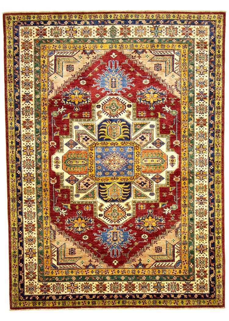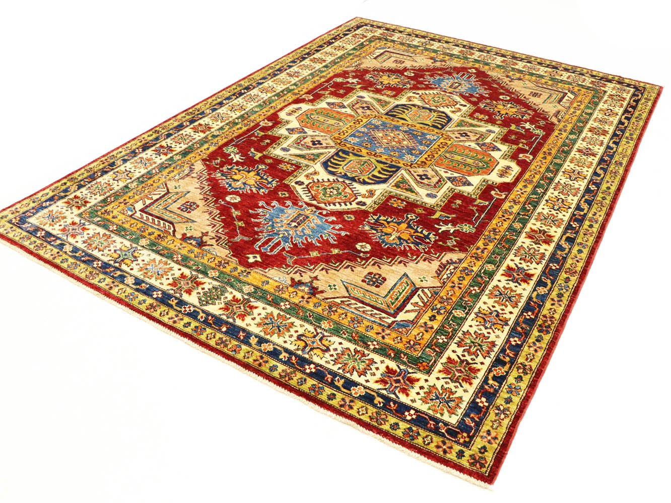 This hand-knotted Kazak, inspired by traditional Caucasian carpets, impresses with its high durability and vibrant colours. These characteristics reflect the rich culture of the Caucasus, which has been known for centuries for its masterful carpet weaving. The simple yet charming shapes and impressively vivid colours carry this tradition out into the world. This Kazak is one of the most sought-after Oriental carpets, both in the Orient and in Europe. Particularly noteworthy is the simple patchwork, which, in combination with the tasteful colour accents, makes this carpet ideal for modern interiors. It combines traditional craftsmanship with contemporary design and fits perfectly with current interior design trends.
