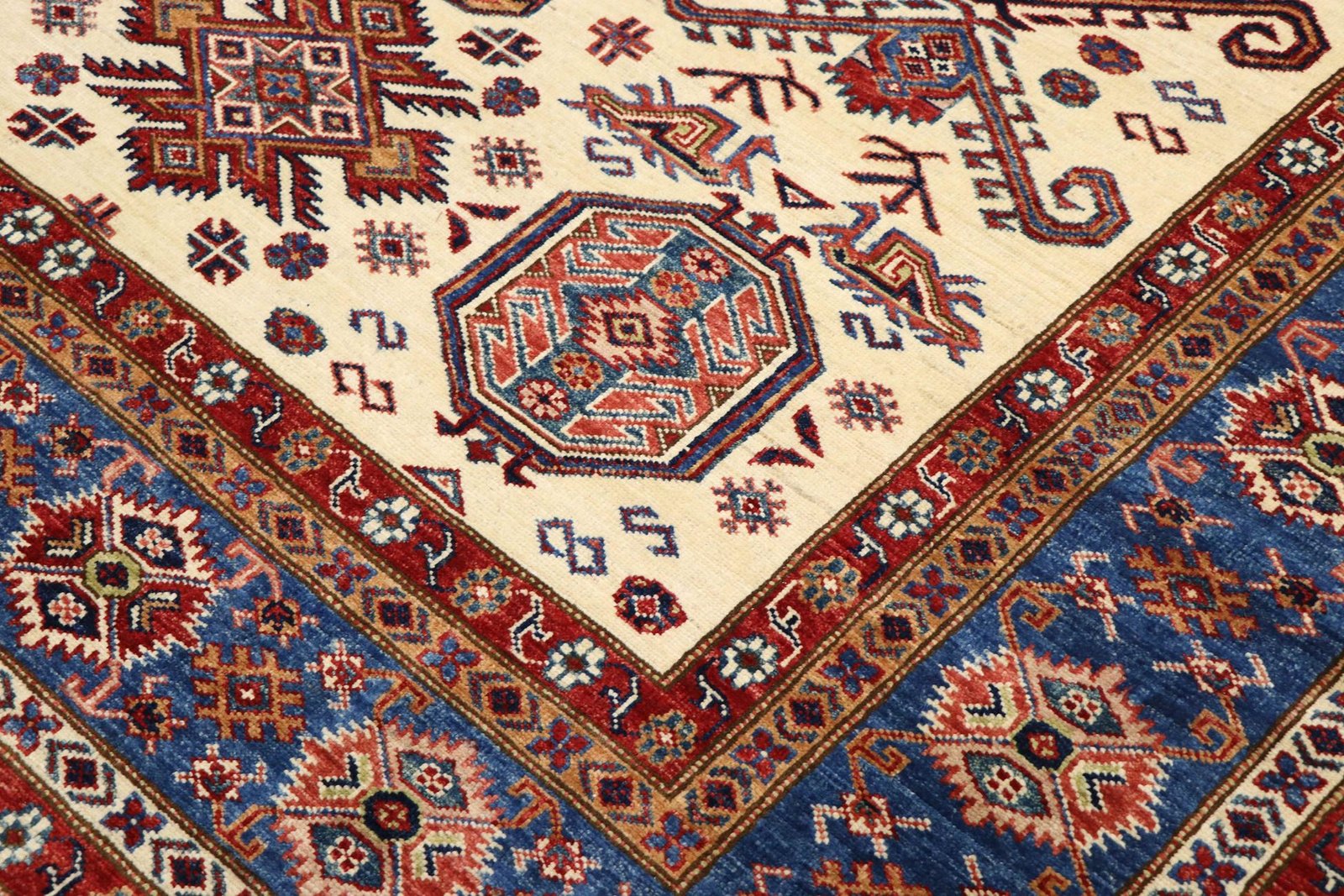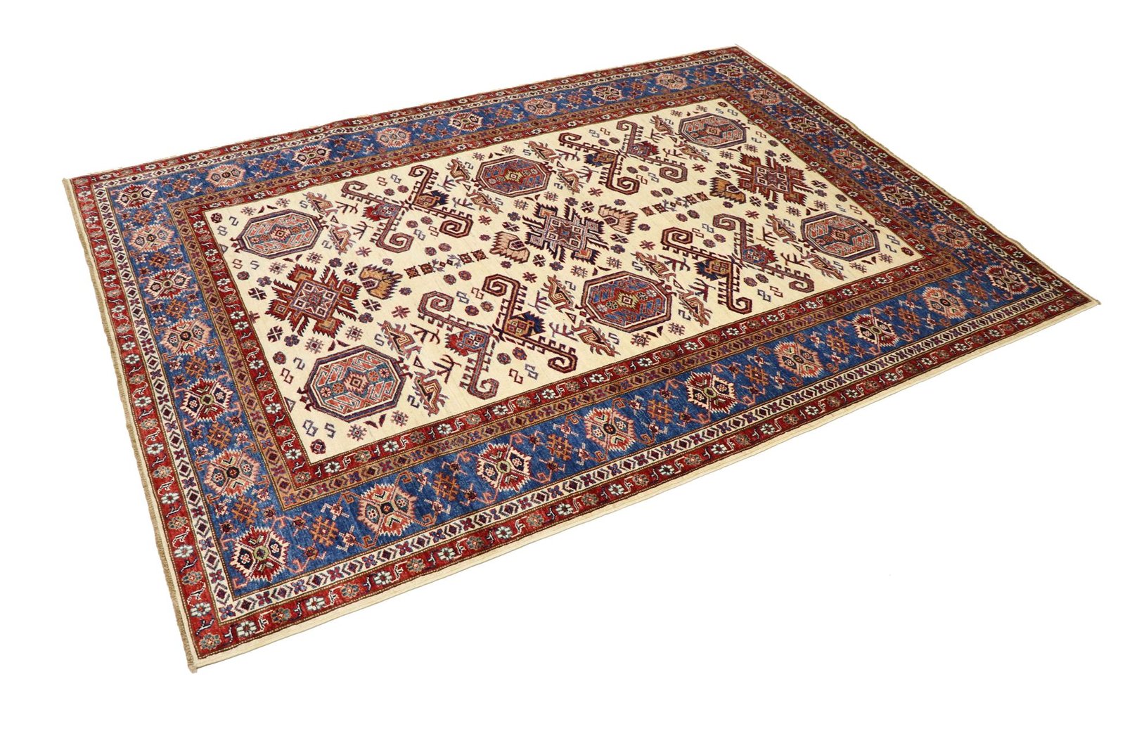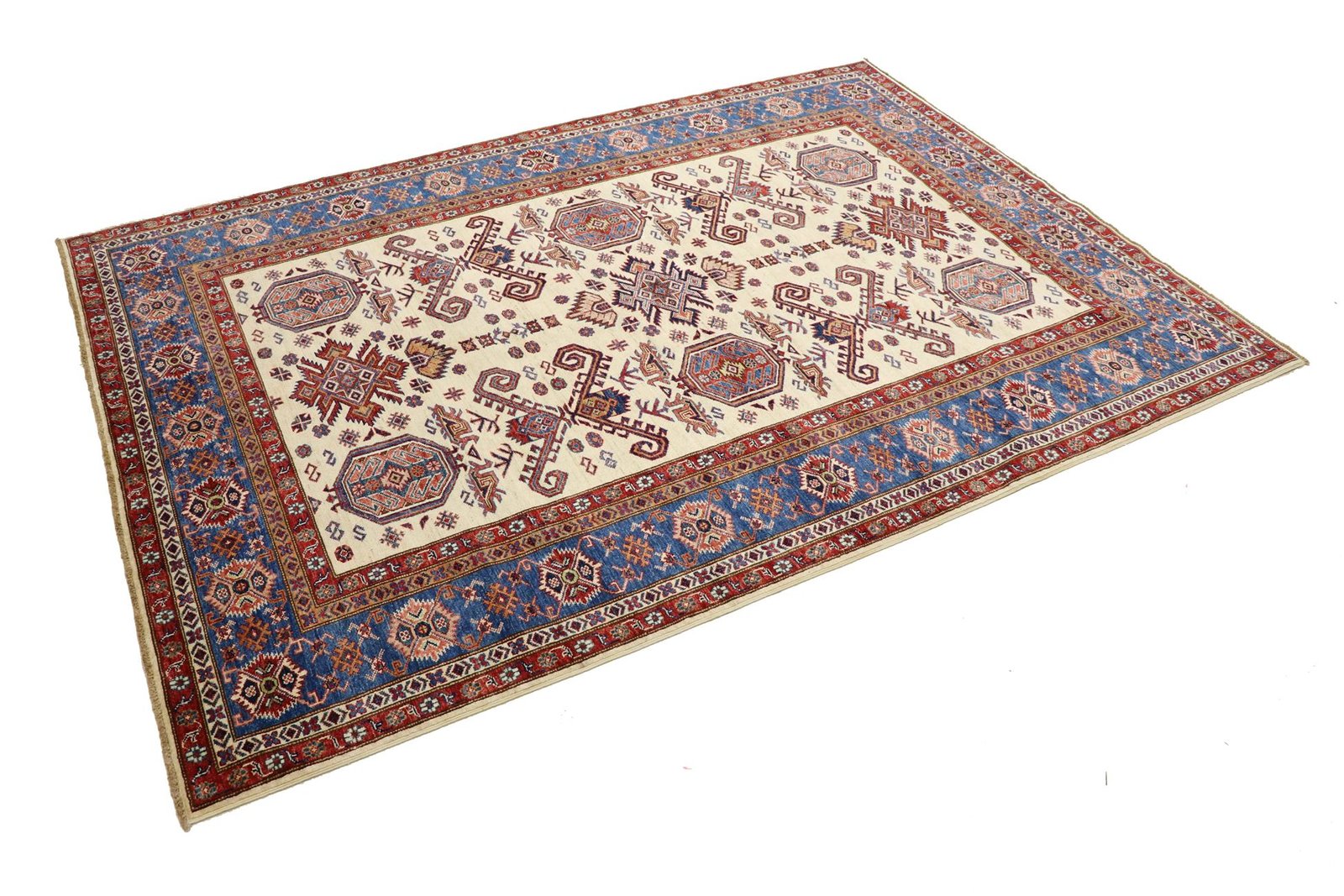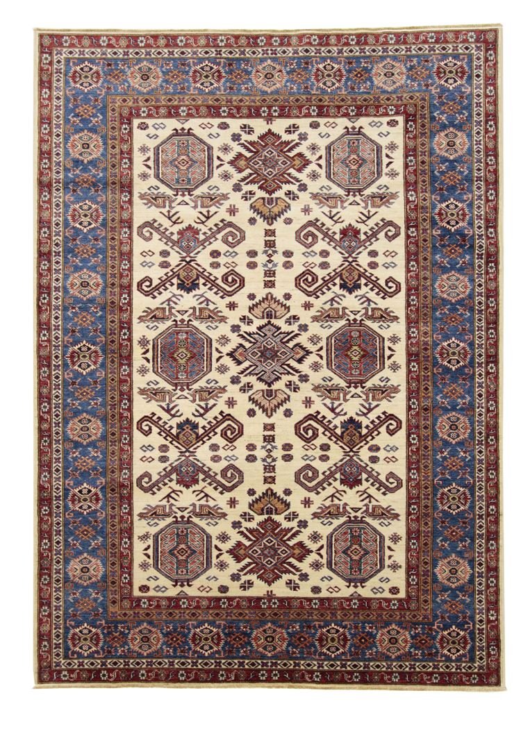 This hand-knotted Kazak, crafted in the traditional style of Caucasian carpets, impresses with its high durability and vibrant colours. It captures the essence of Caucasian culture in a stunning composition that has been renowned for centuries for its mastery of carpet weaving. The carpets are characterised by charmingly simple patterns and vibrant colours that reflect the tradition and aesthetics of the region. Among Oriental carpets, this Kazak is one of the most sought-after both in the Orient and in Europe. Particularly noteworthy are the simple weave and tasteful colour accents, which make it ideal for modern interior styles. It combines traditional craftsmanship with contemporary trends and fits perfectly into current interior design concepts.