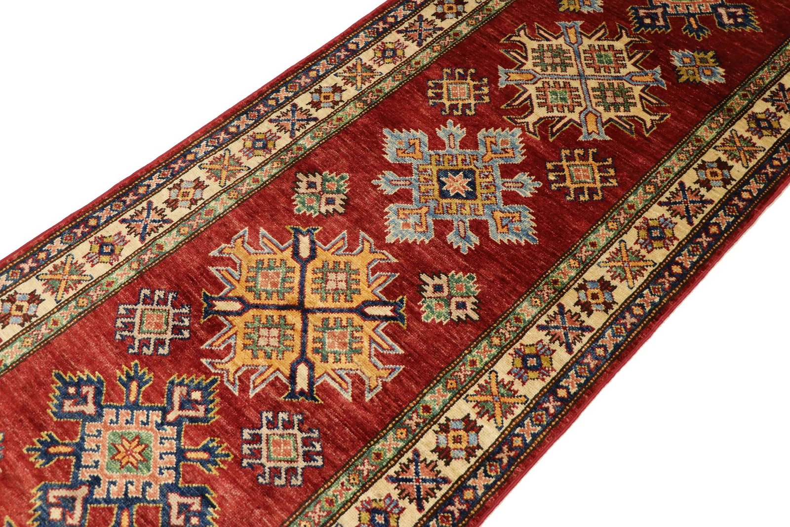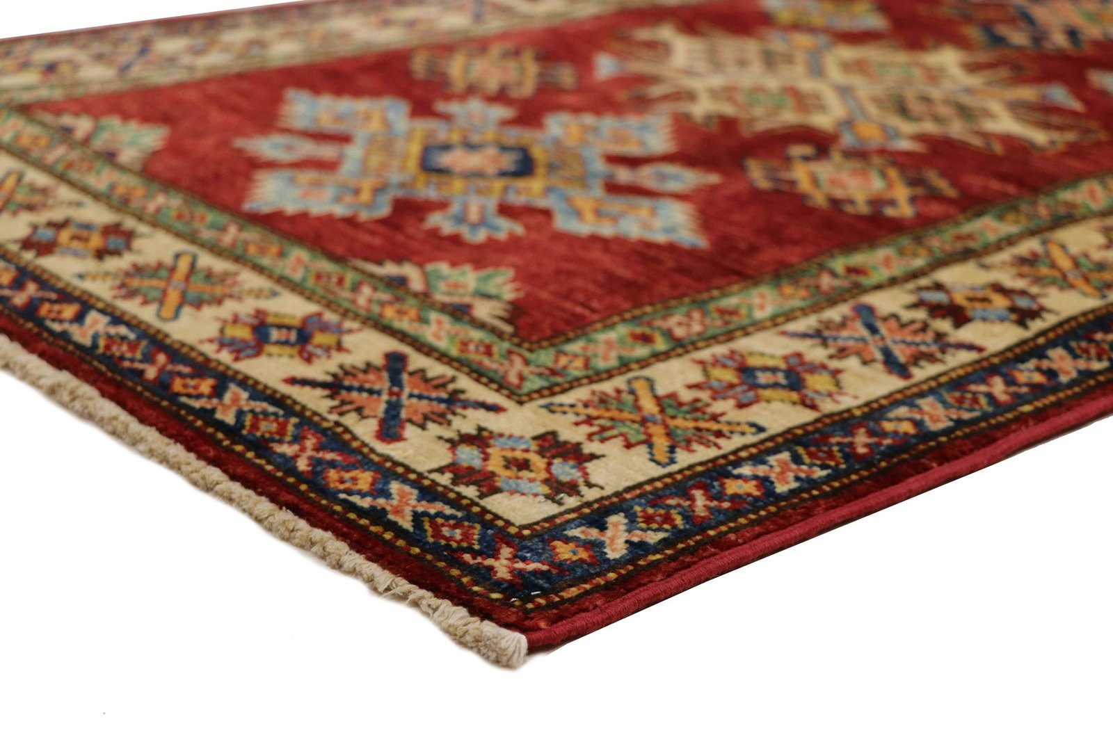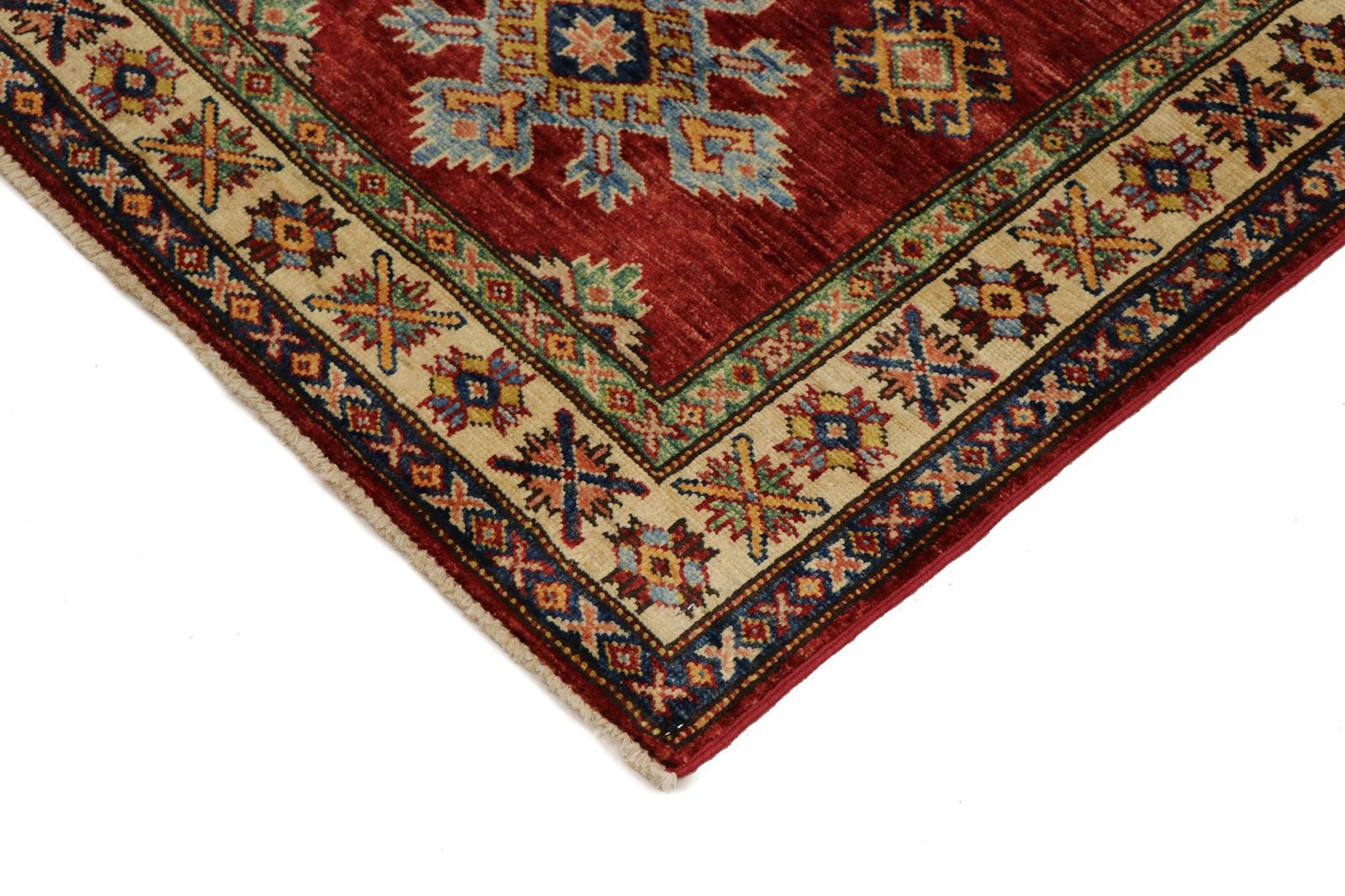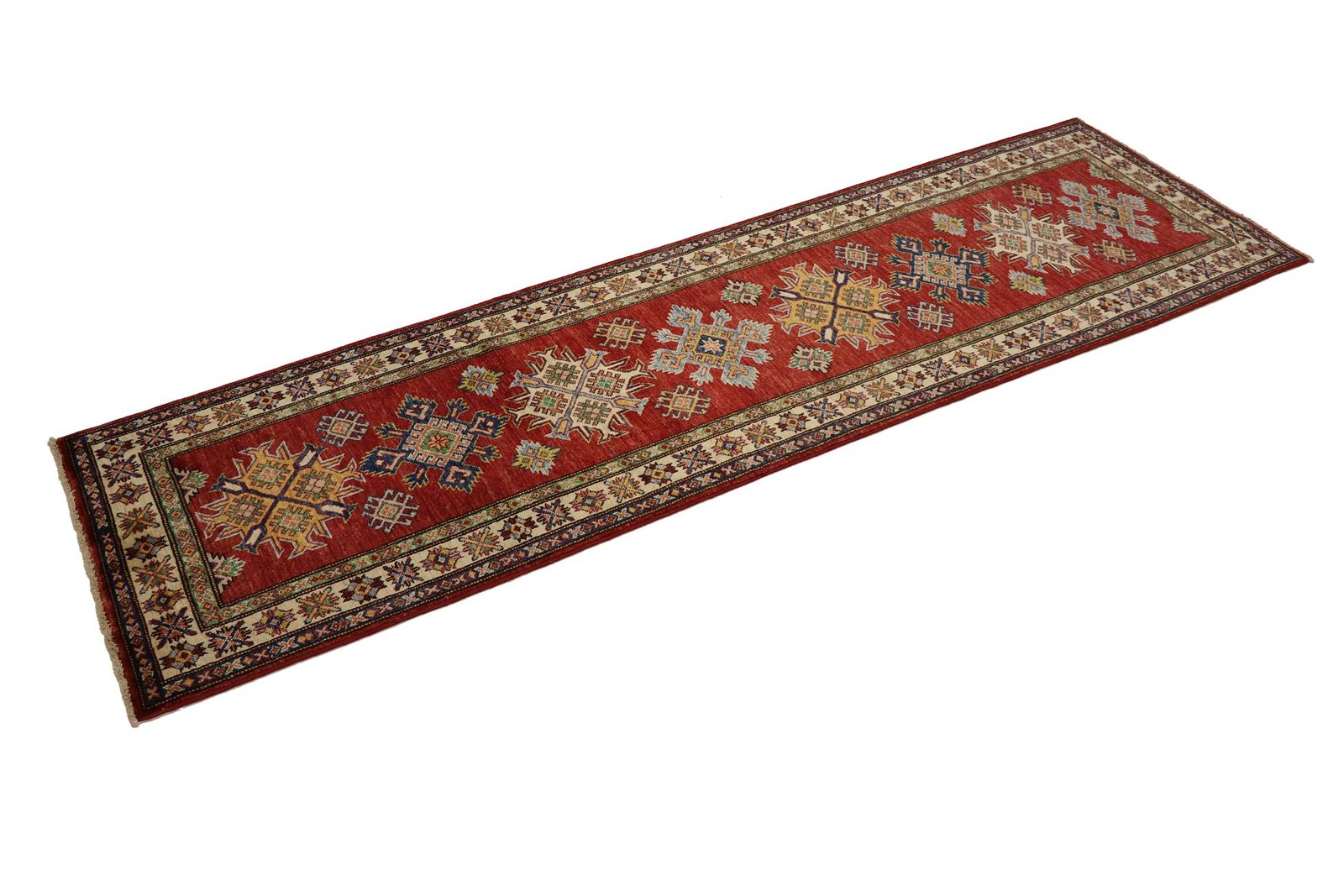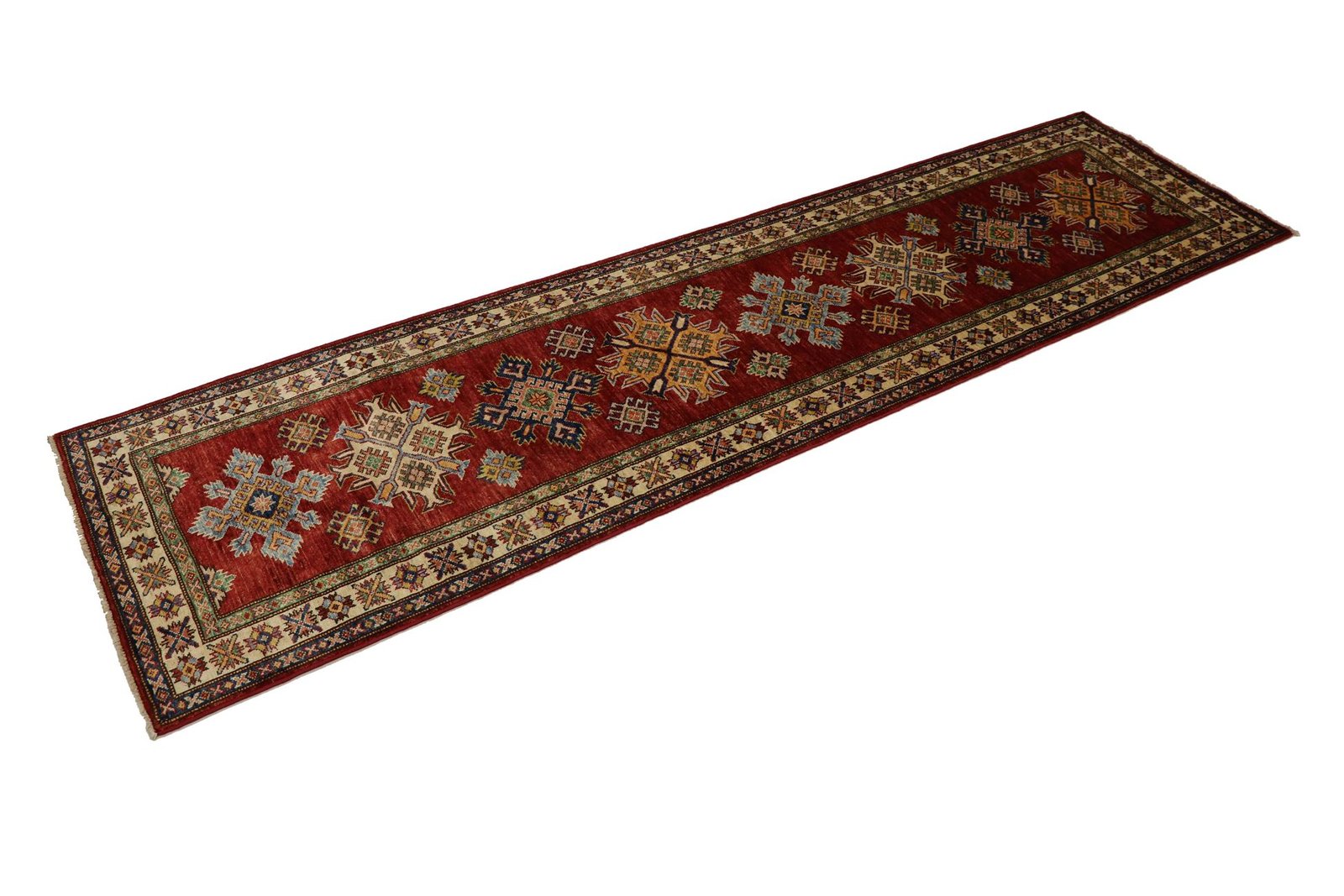 This hand-knotted Kazak, made in the traditional style of Caucasian carpets, impresses with its exceptional robustness and vibrant colours. It beautifully reflects the culture of the Caucasus, which has been known for centuries for its mastery of carpet weaving. The carpets of this region are characterised by their charmingly simple shapes and vibrant colours, which embody the tradition and aesthetics of the Caucasus. Among Oriental carpets, this Kazak is one of the most sought-after both in the Orient and in Europe. The artful simplicity of the weaving and the deliberate colour accents make this carpet ideal for modern interiors. It combines traditional craftsmanship with current interior design trends, making it perfect for mixing and matching.