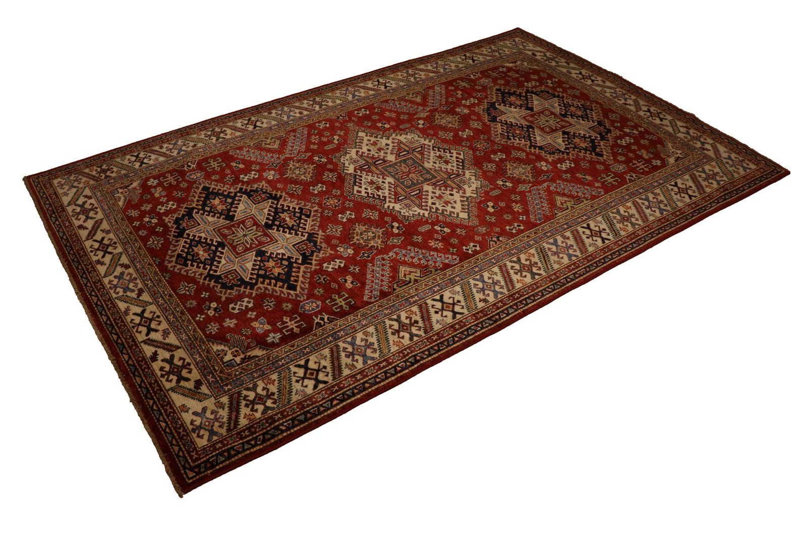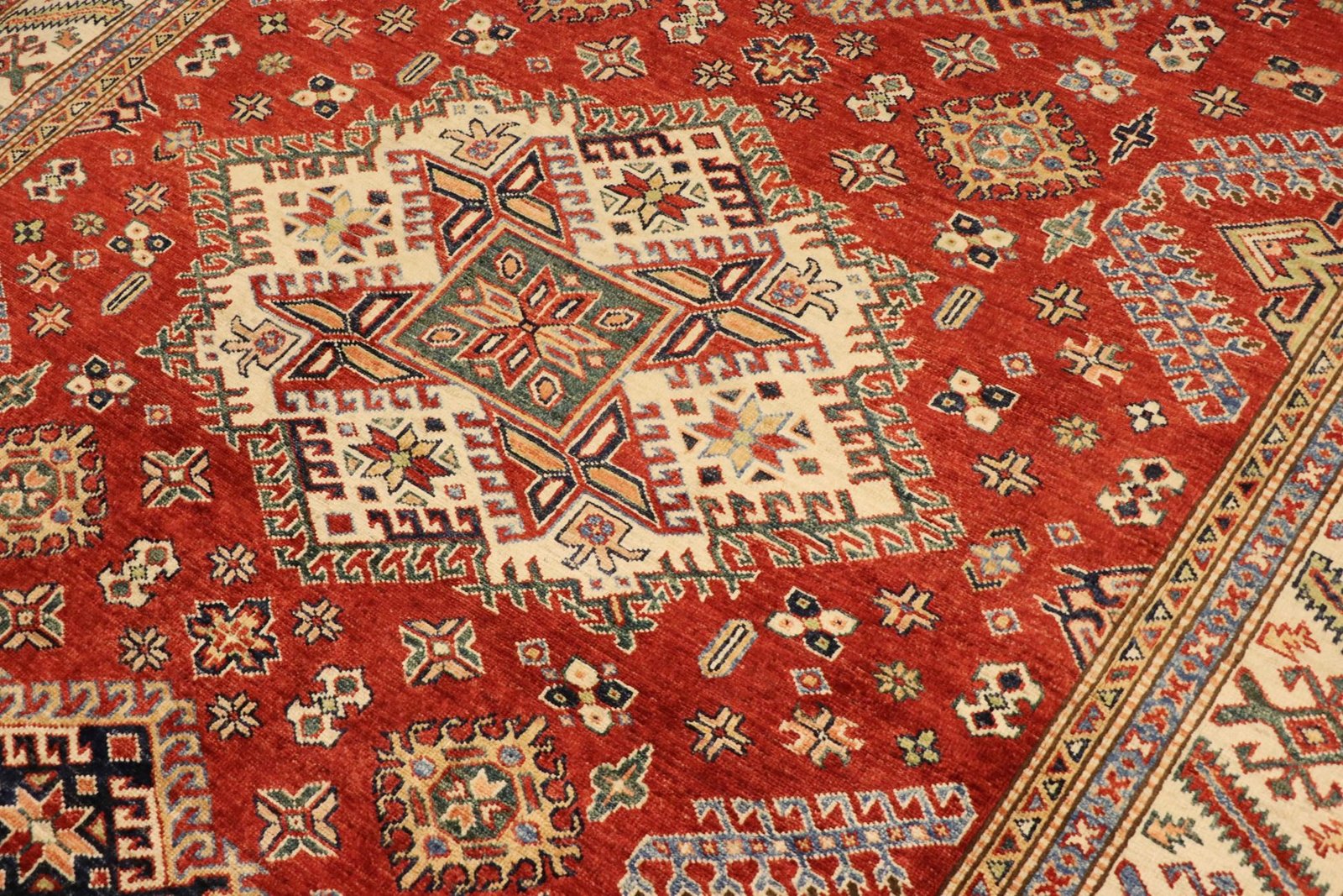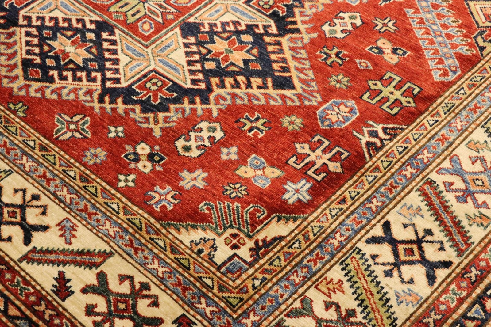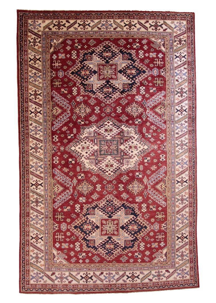 This hand-knotted Kazak, made in the traditional style of Caucasian carpets, impresses with its high robustness and vibrant colours. It embodies the culture of the Caucasus in a beautiful composition that looks back on centuries of carpet artistry. The charmingly simple patterns and intense colours are typical of this region, which masterfully implements the art of carpet weaving. Among Oriental carpets, this Kazak is one of the most sought-after, both in the Orient and in Europe. Its simple patchwork and deliberate use of colour accents make it ideal for combining with modern interior design trends. It combines traditional craftsmanship with contemporary design, making it the perfect addition to any interior.