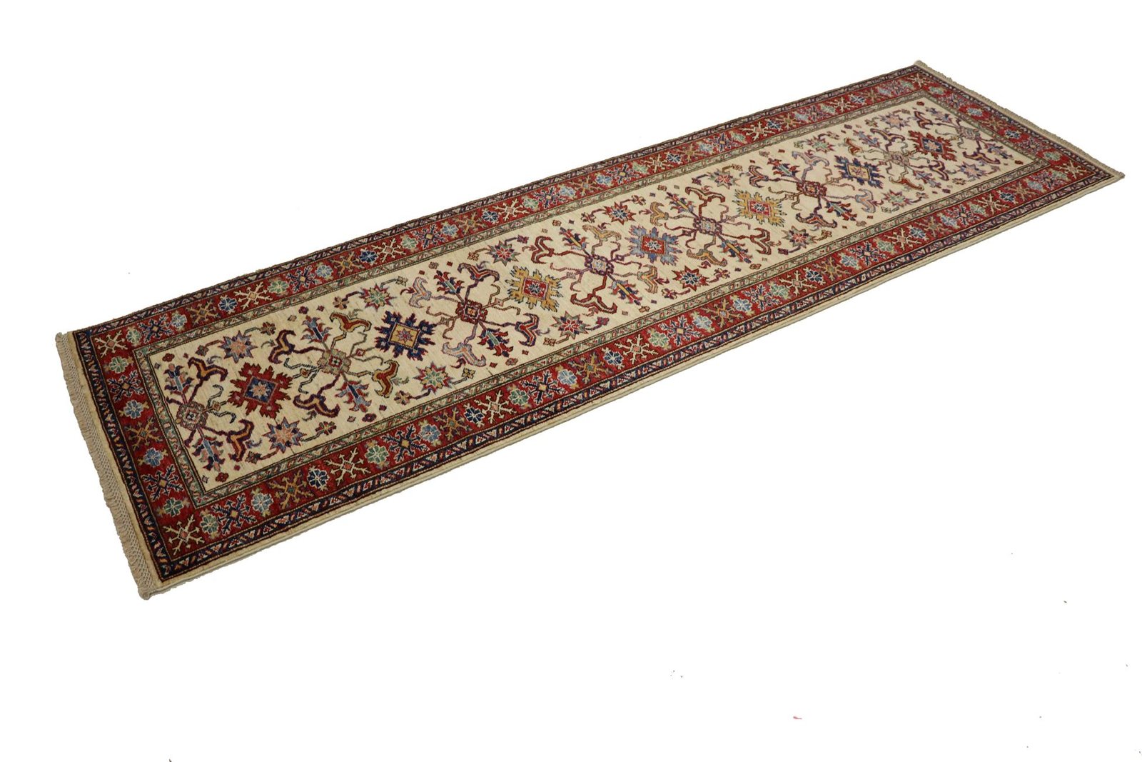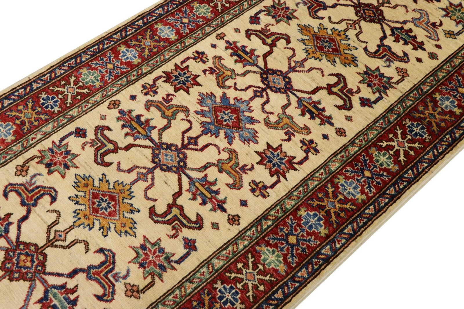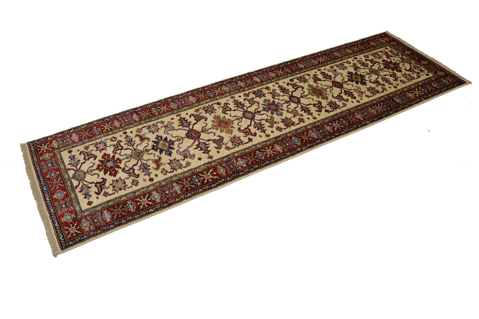 This hand-knotted Kazak is an excellent example of traditional Caucasian carpet art, known for its high durability and vibrant colours. It reflects the culture of the Caucasus in a fascinating composition that has been famous for centuries for its masterful carpet weaving. The simple but charming designs and impressively vivid colours contribute to the uniqueness of this carpet. Among Oriental carpets, this Kazak is one of the most sought-after both in the Orient and in Europe. Particularly noteworthy are the artful simplicity of the patchwork and the harmonious colour accents, which make it ideal for combining with current interior design trends. This carpet combines traditional craftsmanship with modern style and is a perfect addition to any interior design.