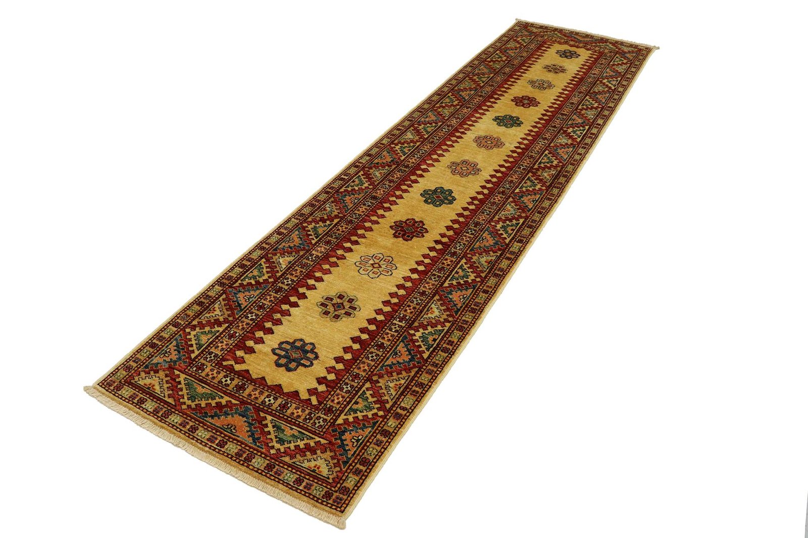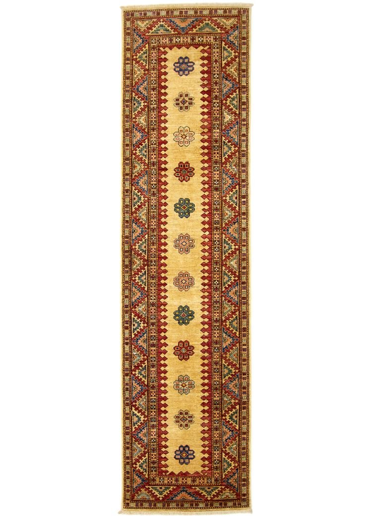 This hand-knotted Kazak, made in the style of traditional Caucasian carpets, impresses with its high robustness and vibrant colours. It reflects the culture of the Caucasus in an impressive composition that looks back on centuries of carpet-knotting artistry. This culture combines simple but attractive patterns with vibrant colours to create a unique design. Among Oriental carpets, this Kazak is one of the most sought-after in the Orient and in Europe. The simplicity of the patchwork and the harmonious use of colour accents make it particularly adaptable to modern interior design trends and preferences. This carpet combines traditional craftsmanship with contemporary style, making it ideal for a variety of interiors.