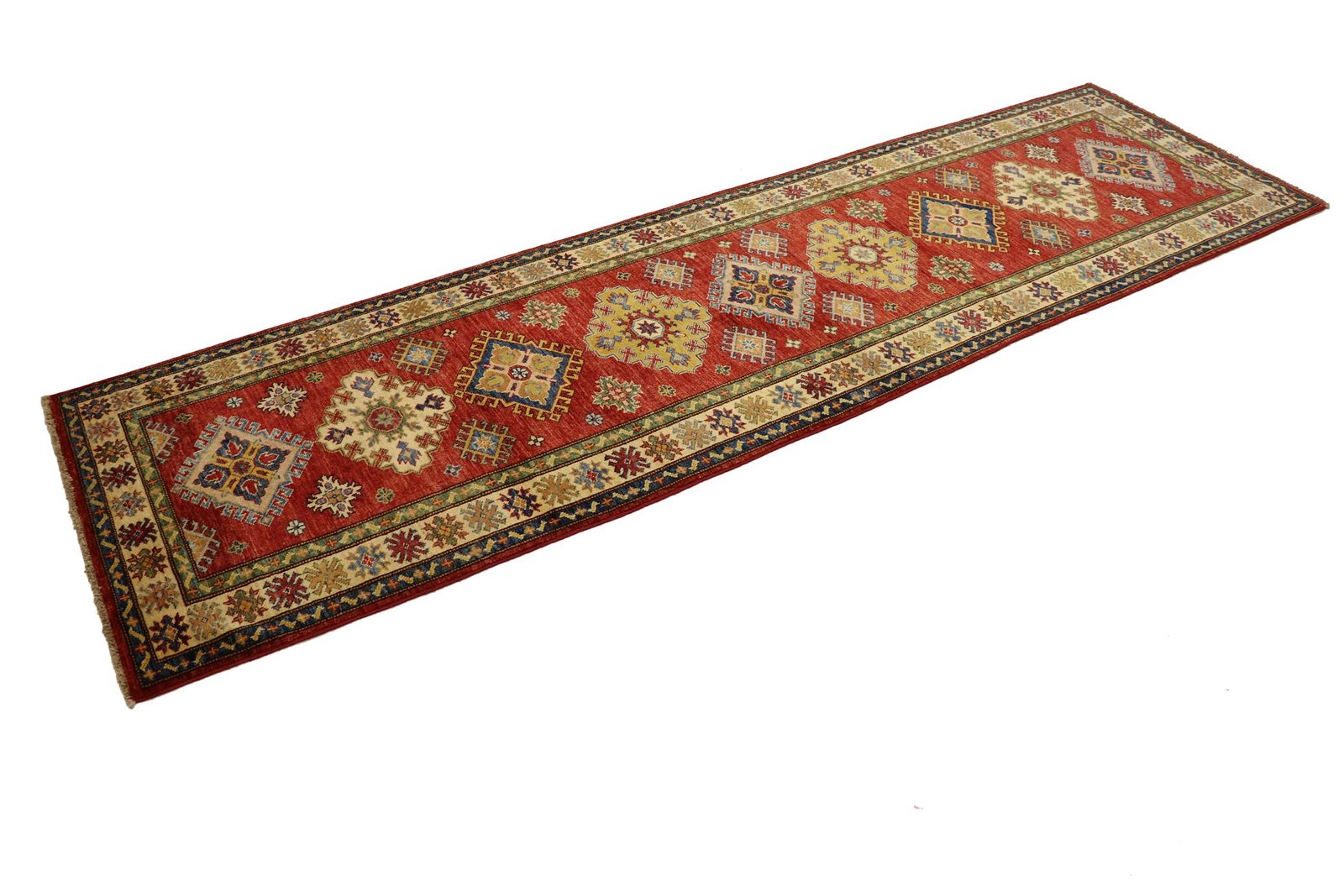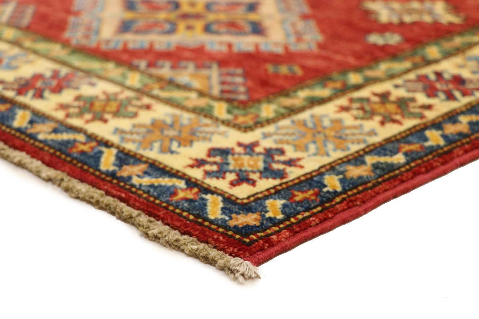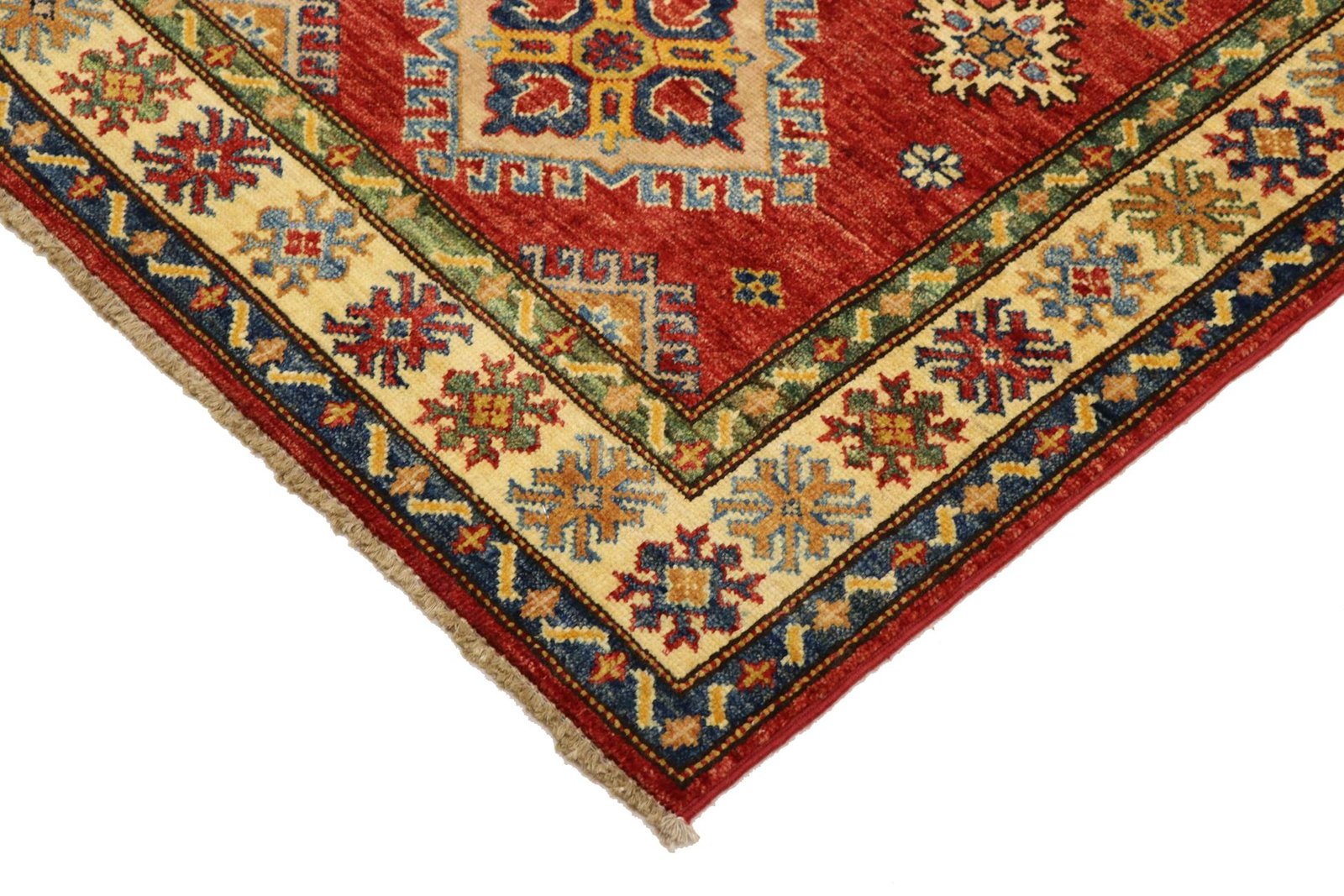 This hand-knotted Kazak, made in the traditional style of Caucasian carpets, impresses with its high robustness and vibrant colours. It reflects the culture of the Caucasus in a beautiful composition that has been known for centuries for its masterful carpet artistry. This culture is evident in simple but expressive patterns and intense colours. Among Oriental carpets, this Kazak is one of the most sought-after both in the Orient and in Europe. Particularly noteworthy are the simple patchwork and the skilfully placed colour accents, which make it ideal for combining with modern interior design trends. The carpet combines traditional craftsmanship with contemporary design and blends harmoniously into current interior designs.
