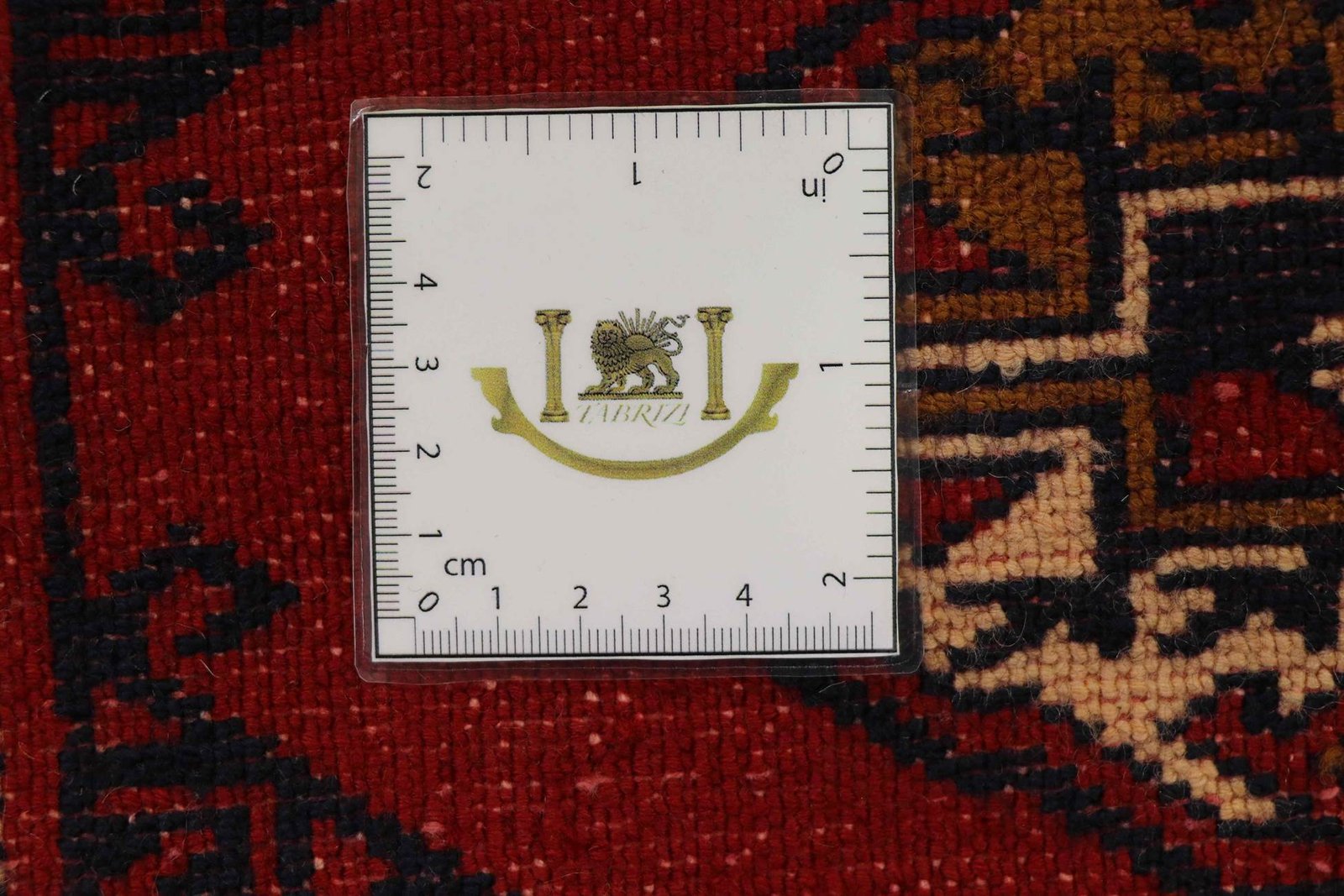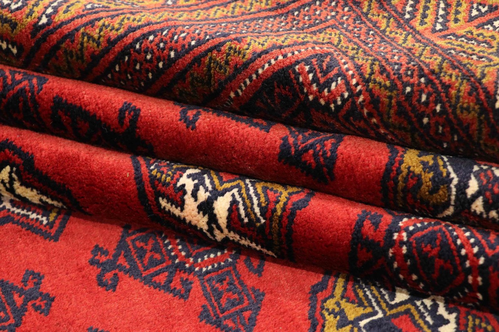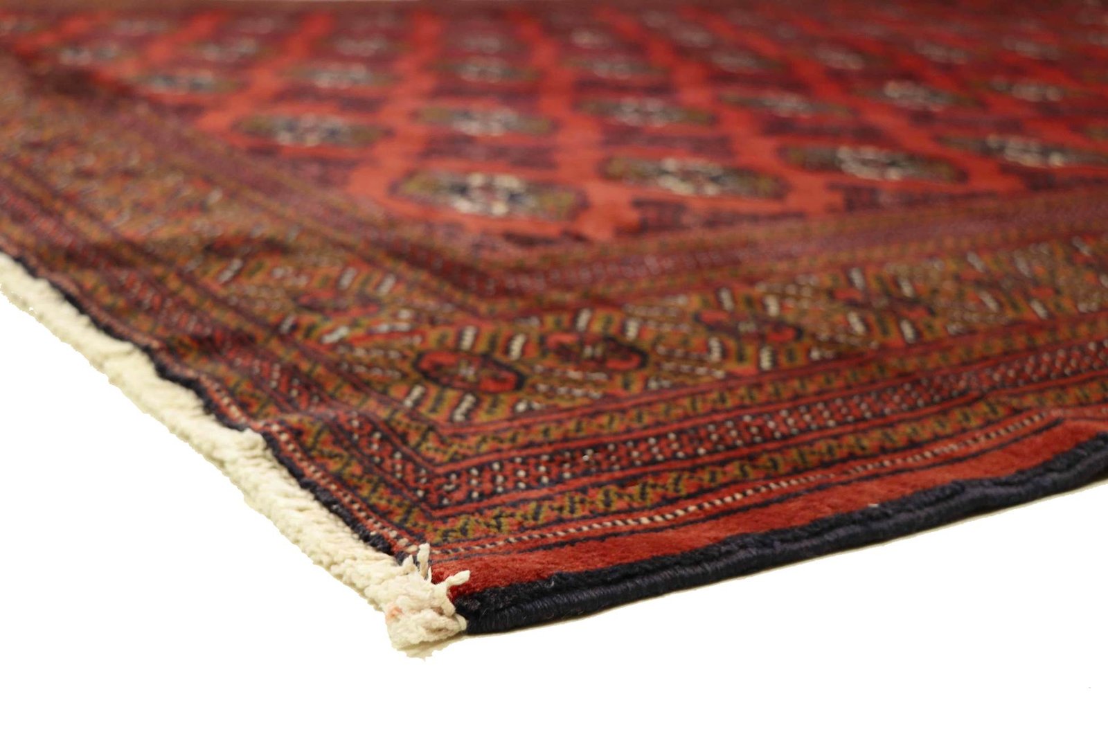 This Turkaman carpet, hand-knotted from high-quality sheep’s wool with a high fat content, impresses with its high standard of workmanship. Its warm, dark colours and traditional patterns are typical of Turkmen culture and bring a touch of the Orient into your home. The robust wool ensures durability, while the characteristic red tones and designs give the carpet a distinctive aesthetic. An outstanding example of craftsmanship, this carpet combines beauty and functionality, ideal for a cosy living atmosphere.